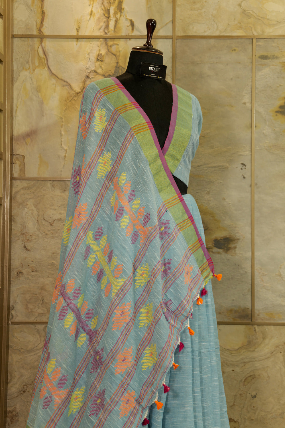 Light Blue Linen with geometric weaving pattern on Pallu Light Blue Linen with geometric weaving pattern on Pallu, with Jari on both the sides. Tasseled fringe with vibrant pom pom