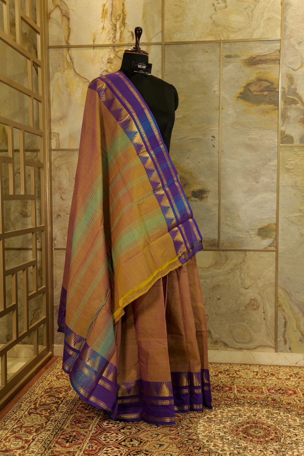 Brown - purple shaded dual tone chettinad with broad traditional temple borders on both the sides
