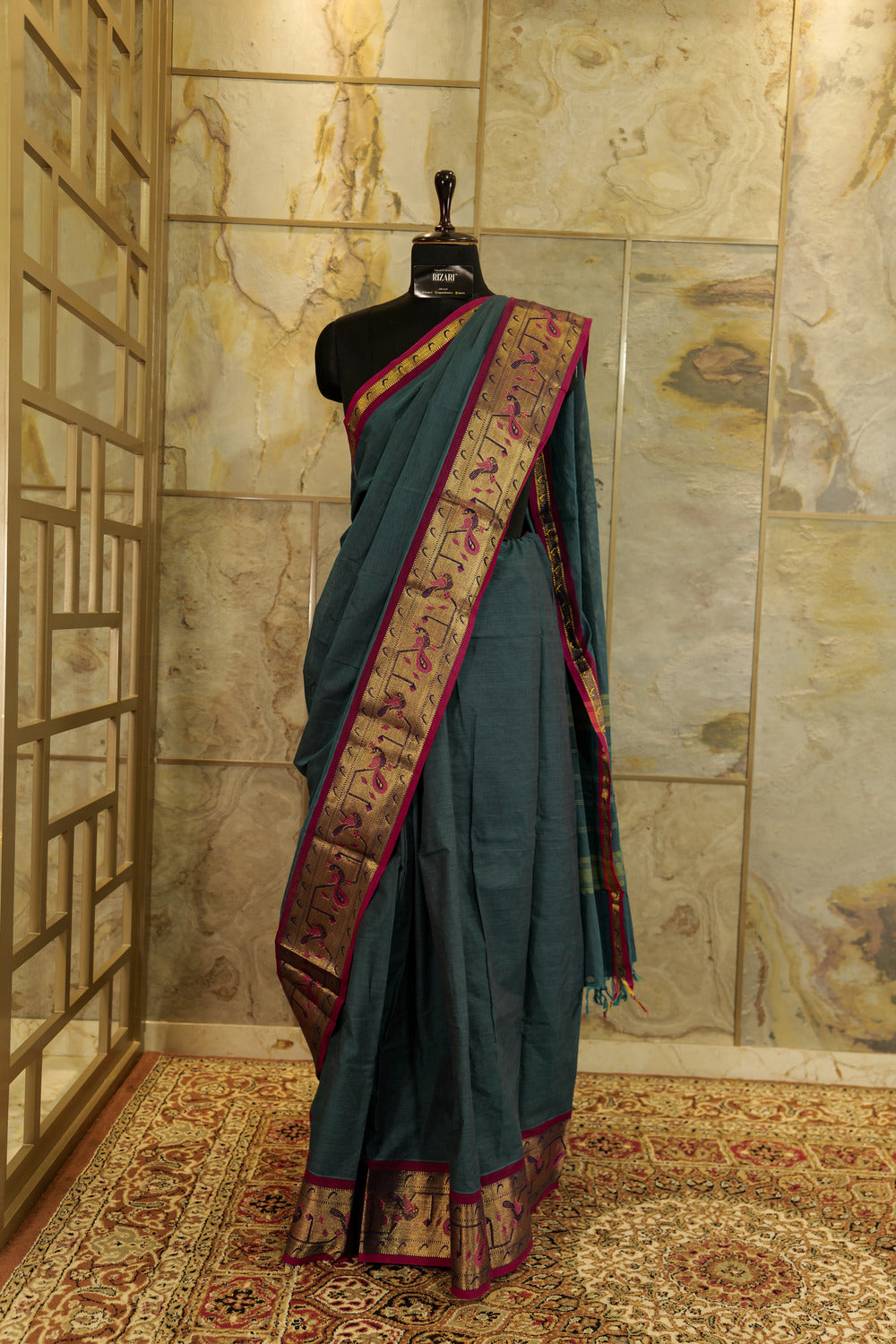 "Chettinad cotton Peacock green plain saree with contrast marron border with beautiful peacock motif weaved on jacquard palllu , Pallu with tassels