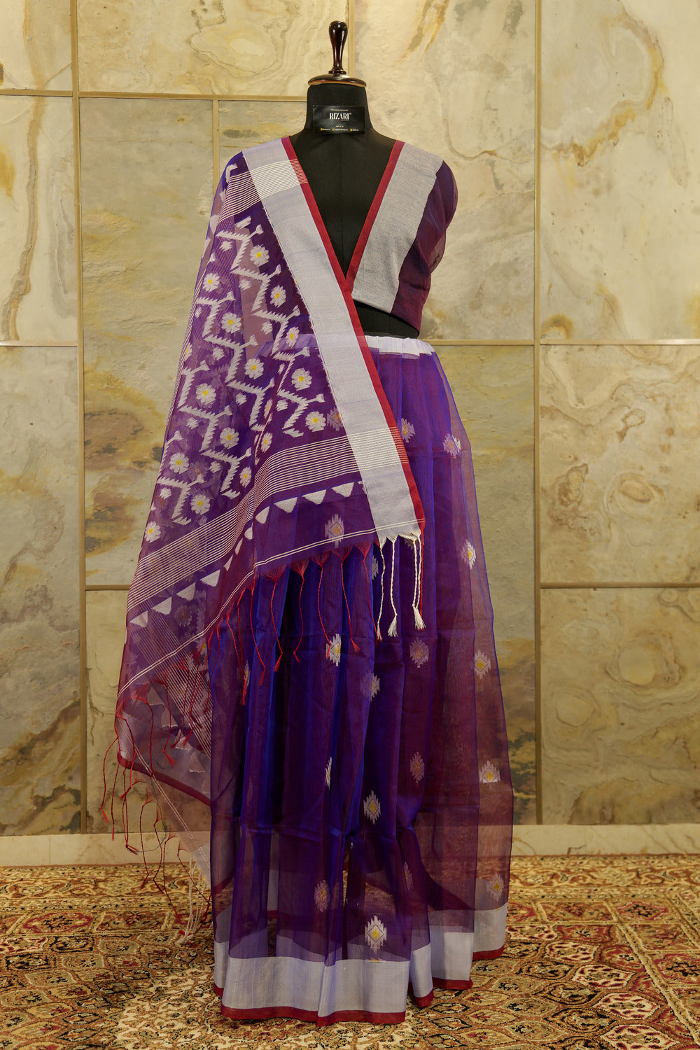 Dual tone Purple and Red Benarasi Jamdani Exclusive Resham Handwoven Saree with tassel fringe with dual color Meena buttas; white and red border and intricate butta design on Pallu