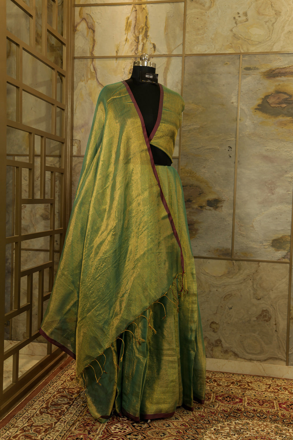 Green and Gold tone Tissue Saree Green and Gold with Tassel fringe and burgundy thin border with running blouse piece. The light texture makes it suitable even for summer.