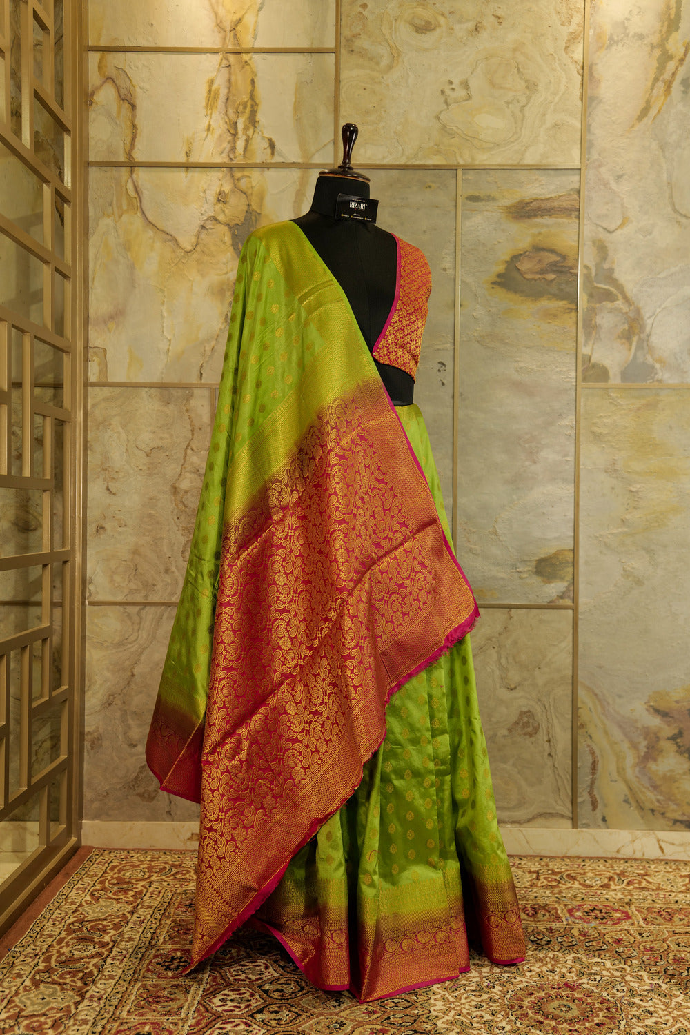 Green soft silk banarasi all over buttas with contrast pink brocade Pallu and pink brocade blouse