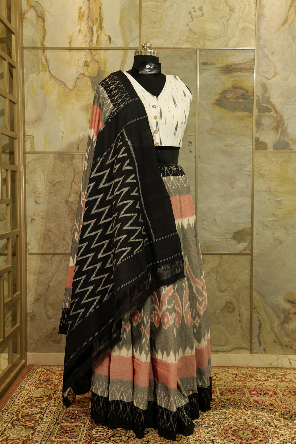 "Authentic handwoven pure cotton Grey Pink handwoven Pochampalli with contrast black Pallu and border with unique birds figurine woven on the body