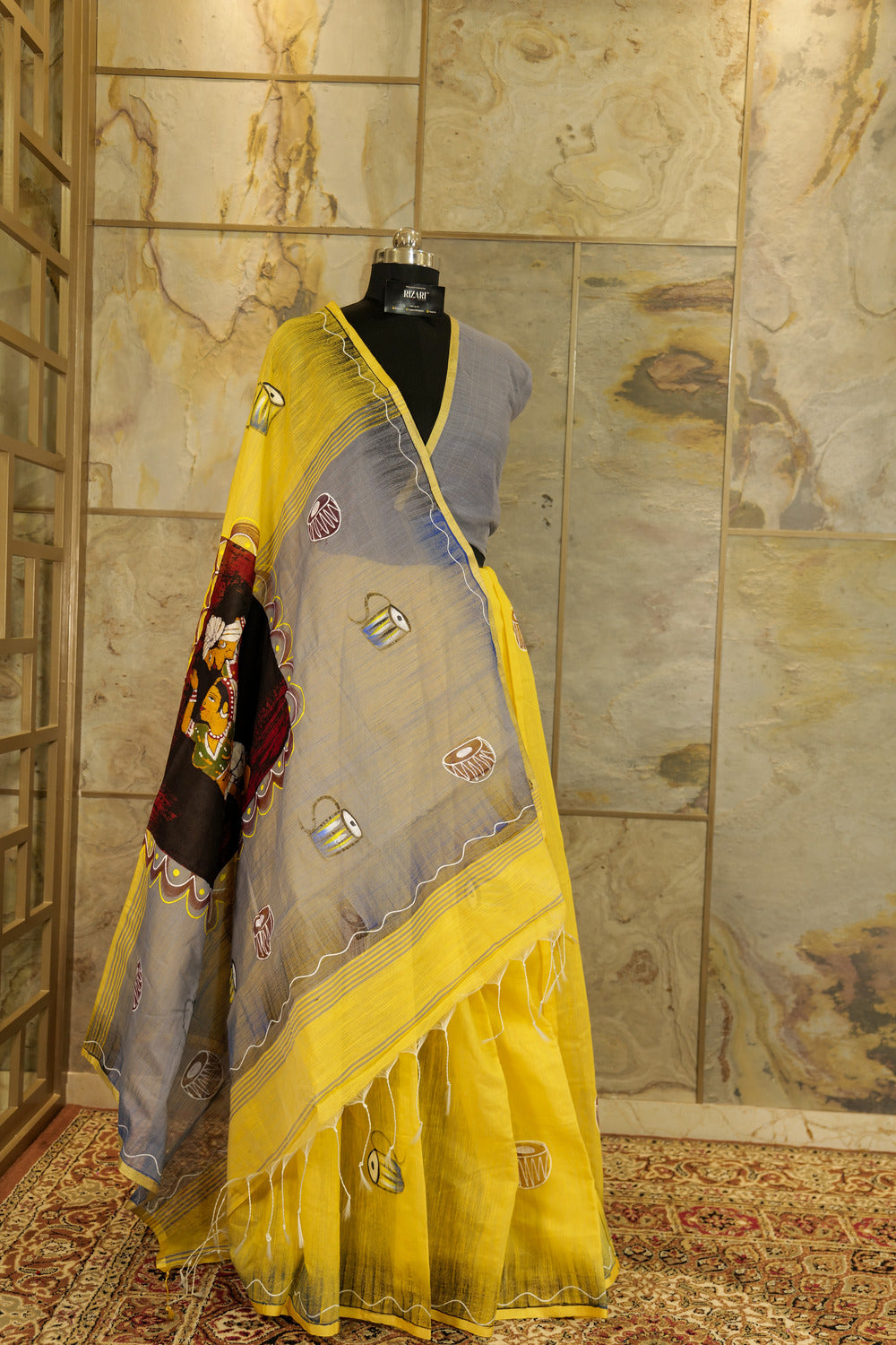 "Hand painted Lemon yellow cotton saree with grey pallu- with Batik lady figurine on Pallu