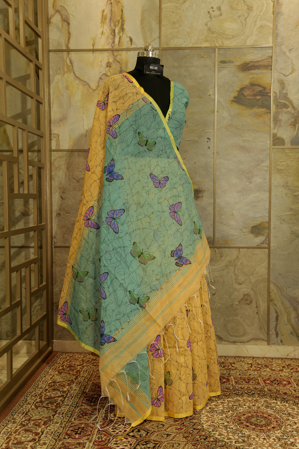 "Hand painted Pastel peach shade saree with pastel green Pallu and blouse with beautiful butterflies all over
