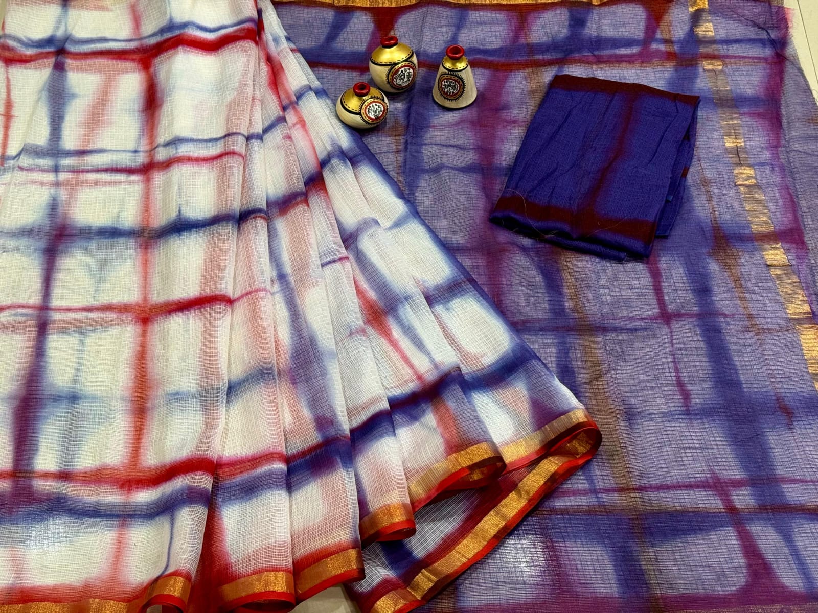 Kota Doria Block Printed Sarees with blouse piece fabric (contrast printed).