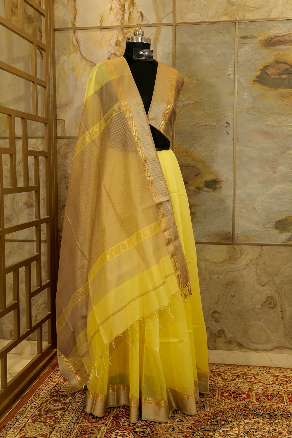 Lemon yellow Maheshwari Saree plain lemon yellow saree with light Beige Pallu with golden lining all over Pallu and tassel Pallu. with plain blouse with silver Resham border. Fully handwoven saree