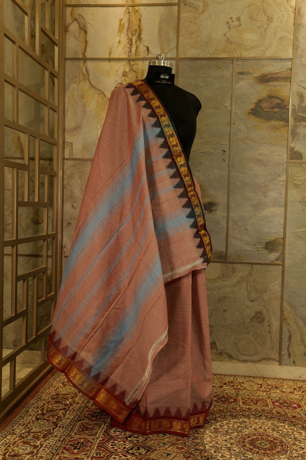 Light brown chettinad cotton saree with ganga jamuna borders with delicate peacock motifs & temple border design