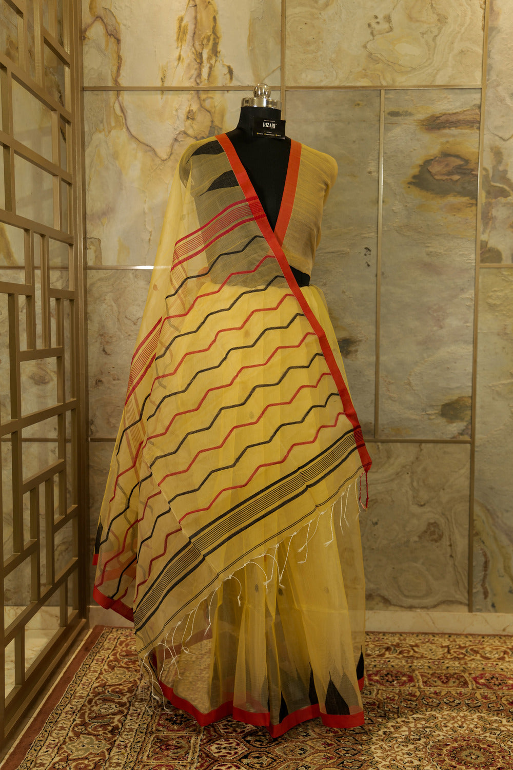 Light Mustard handwoven Exclusive temple border Resham jamdani saree. Off-white saree with red and black zig zag weaving on Pallu and all over butti with temple border weaving, with red thin border. Resham jamdani. With tassel fringe