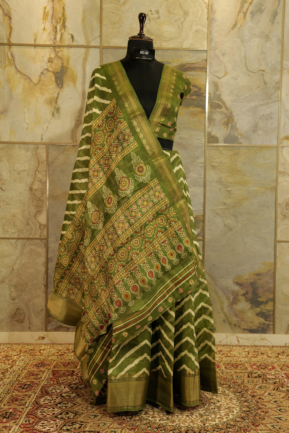 "Mehendi green Ikat print semi tussar daily wear saree with, super soft and light weight fabric suitable for office wear and casual occasions