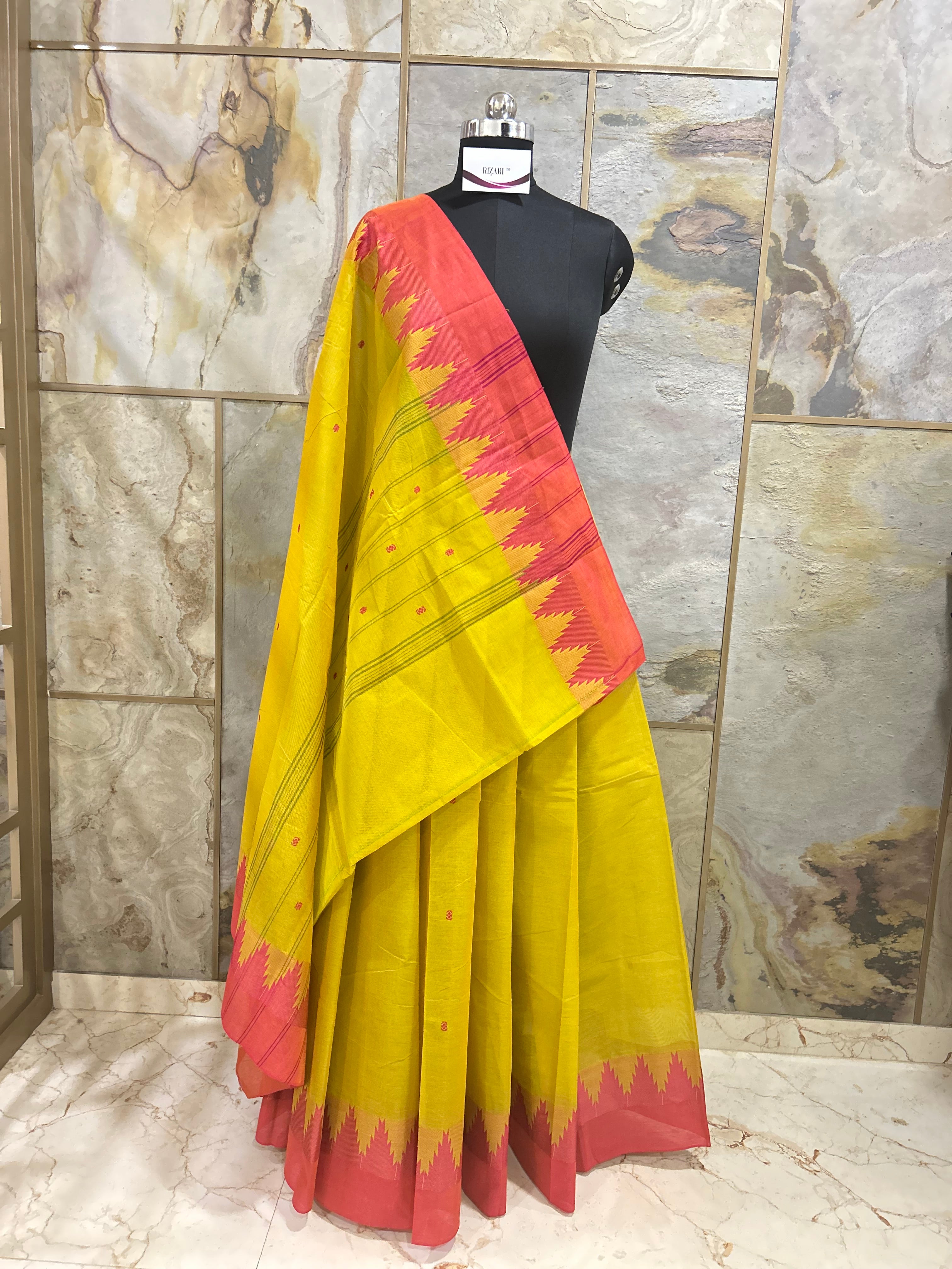 This Cotton Saree is an elegant and versatile choice for daily wear and formal events. The traditional border and Butti's all over the saree and temple border add a touch of traditional charm, while the running blouse piece in the same color ensures a perfect fit. Made of high-quality cotton, this saree offers comfort and durability.