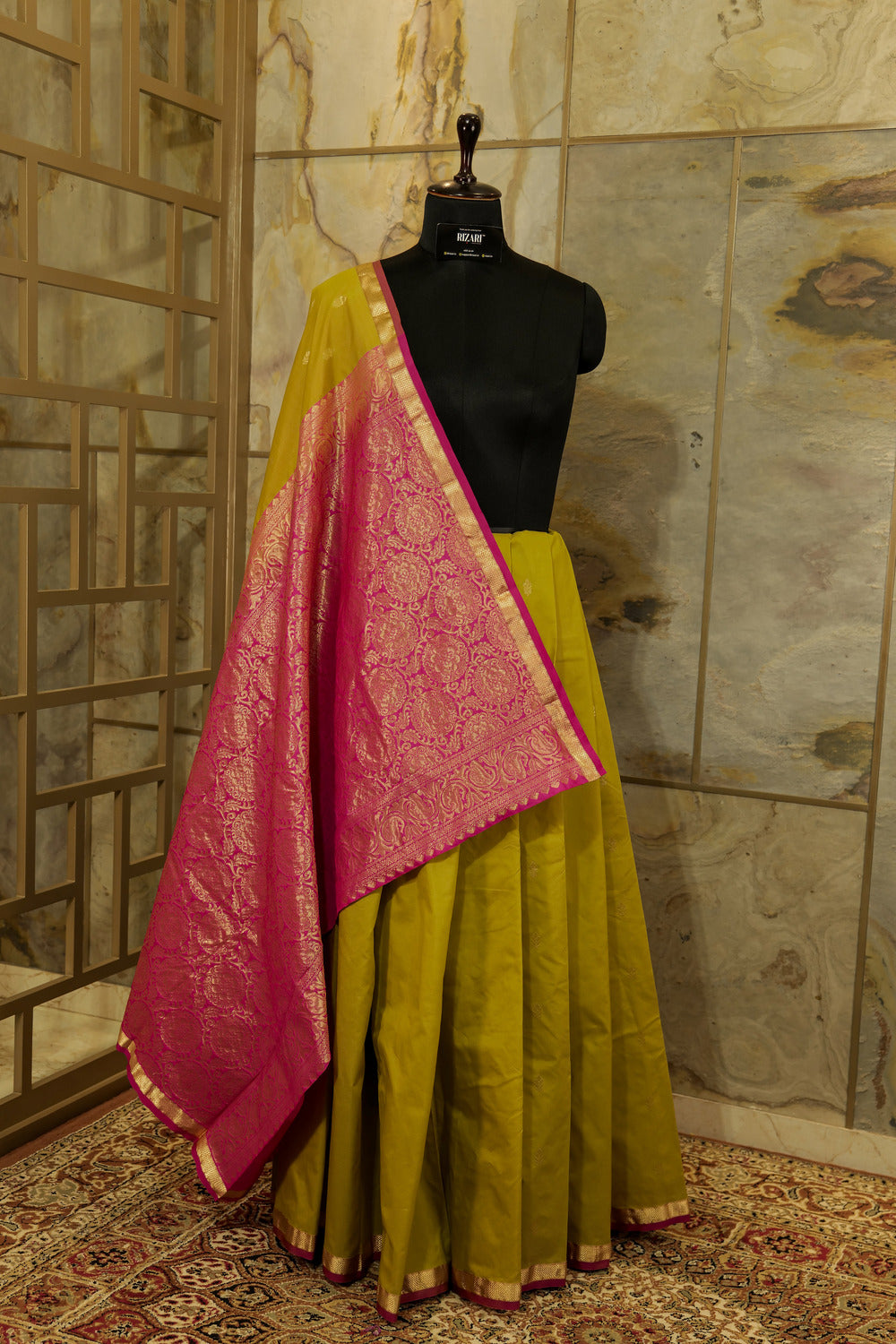 "Olive Green and Pink Kanchi silk saree Kanchi pattern semi silk saree with Jari motifs woven all over body pink delicate border and brocade Pallu