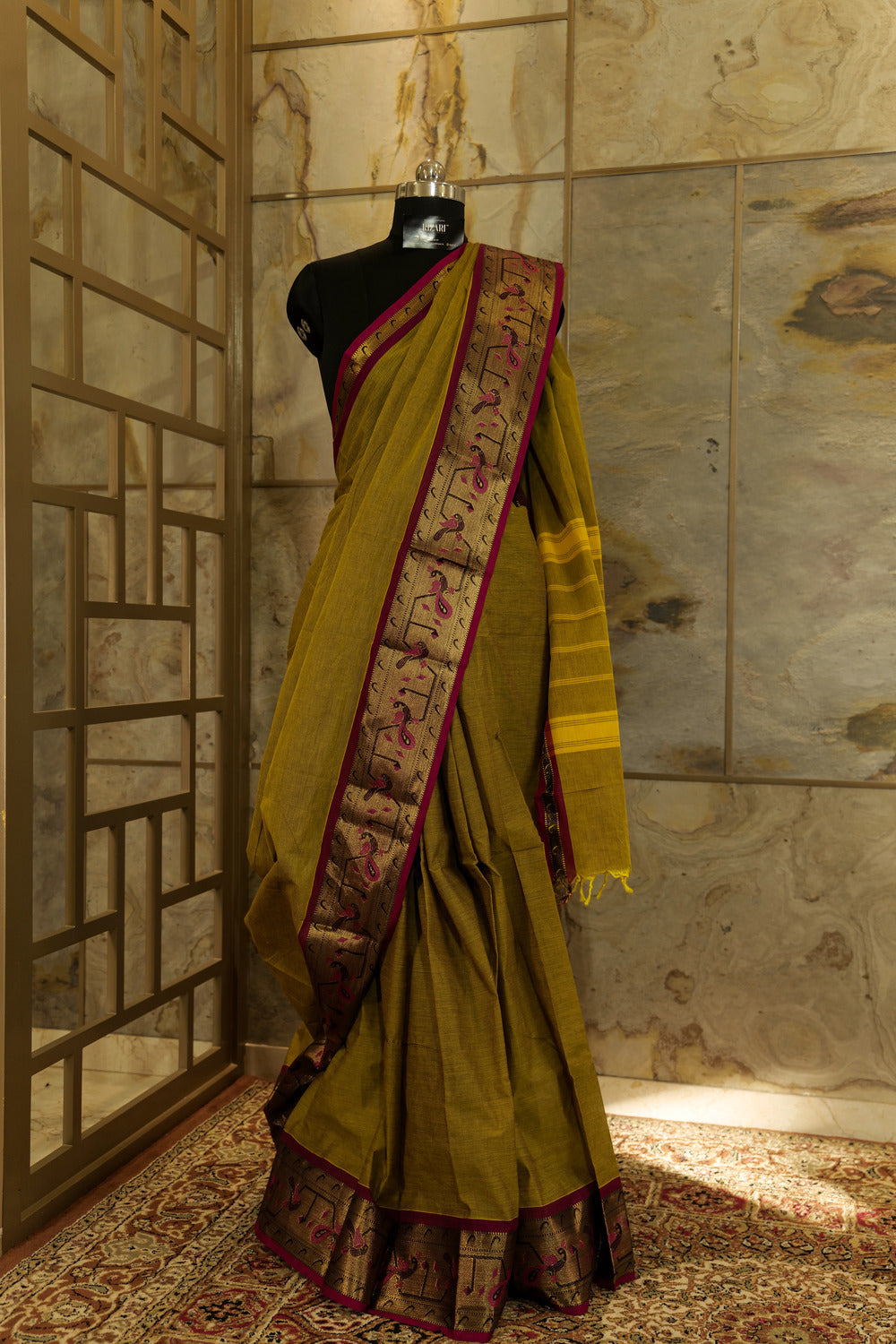 "Chettinad cotton olive green saree with marron border with beautiful peacock motif beautifully weaved with Jari border , tasseled fringe Pallu