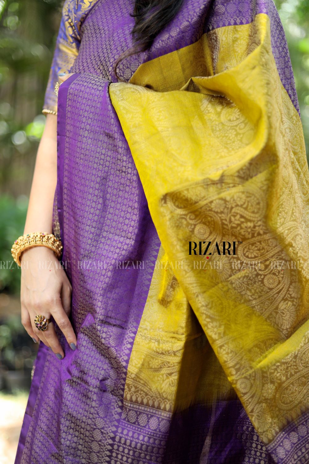 Handwoven exquisite pure Kanchipuram silk saree contrast turning border on both sides with Jari brocade weaving all over body, contrast weaving Pallu with tassels. Contrast plain purple blouse piece.