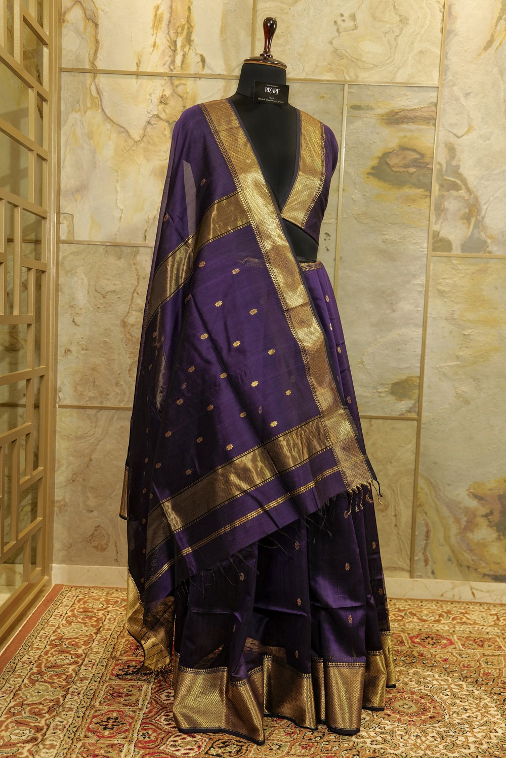 Purple Maheshwari Silk Saree with all over gold Jari Butta on body with rich broad border in matt gold. With tassel Pallu Blouse: Unstitched Blouse Piece
