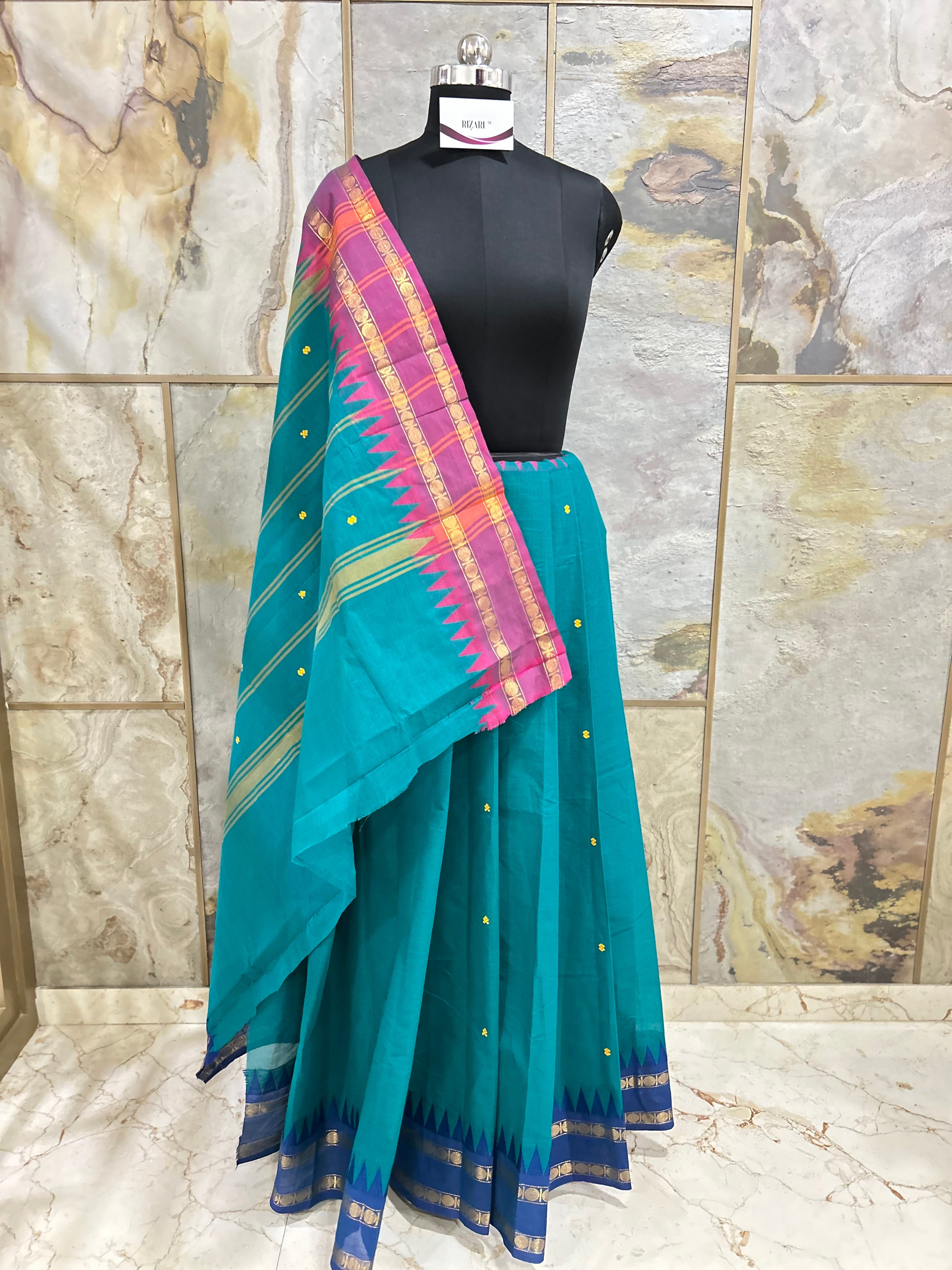 Expertly designed and crafted, our Sea Green Cotton Saree with Temple Border is the perfect combination of comfort and style. The traditional border and Butti's all over the saree add a touch of elegance, making it suitable for daily wear, formal occasions, or events. The included running blouse piece completes the look, making it a versatile and timeless addition to any wardrobe.