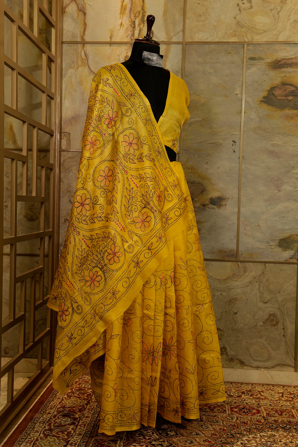 Katha tussar saree in vibrant yellow color with katha embroidery work . Katha light weight semi tussar fabric, Plain running Blouse Piece with delicate small border